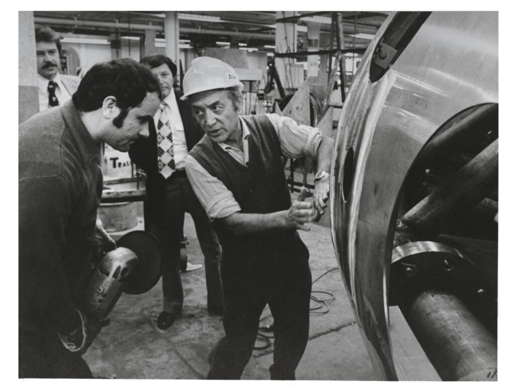 Isamu Noguchi working on the Horace E. Dodge Fountain for Philip A. Hart Plaza at Allied Bronze, Queens, New York