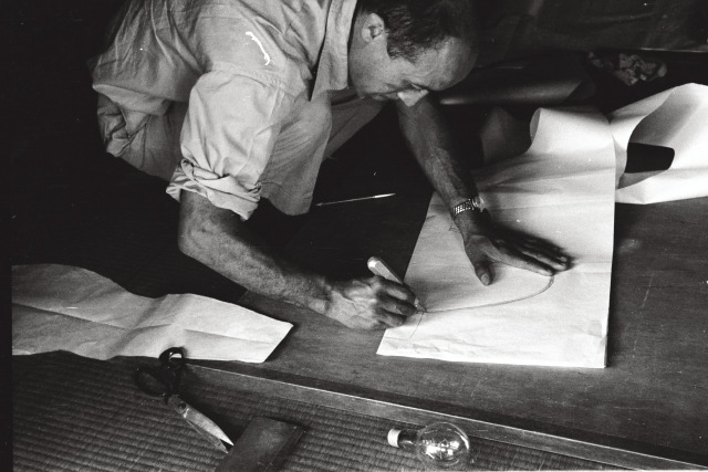 Isamu Noguchi working on designs for Akari in Japan