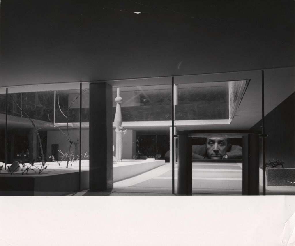 Isamu Noguchi with model for Lever House courtyard, 1952. Photo by Charles F. Uht / The Noguchi Museum Archives, 03806. © 2026 The Isamu Noguchi Foundation and Garden Museum, New York / Artists Rights Society (ARS), New York.