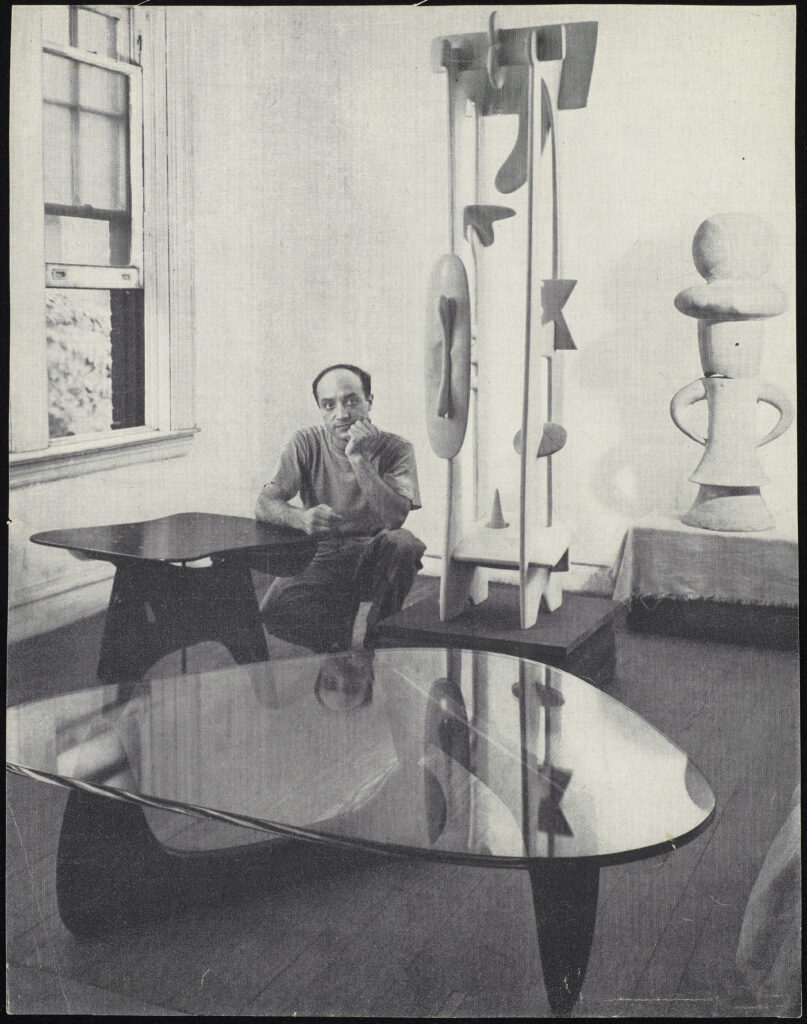 Isamu Noguchi with a Chess Table (IN-61), Coffee Table (IN-50), Statue, and The Queen in his MacDougal Alley studio, New York, from “Sculptor Noguchi Designs Free-Form Tables,” House & Garden, January 1948. Photo by Geoffrey Baker / The Noguchi Museum Archives, 143954. © 2026 The Isamu Noguchi Foundation and Garden Museum, New York / Artists Rights Society (ARS), New York.