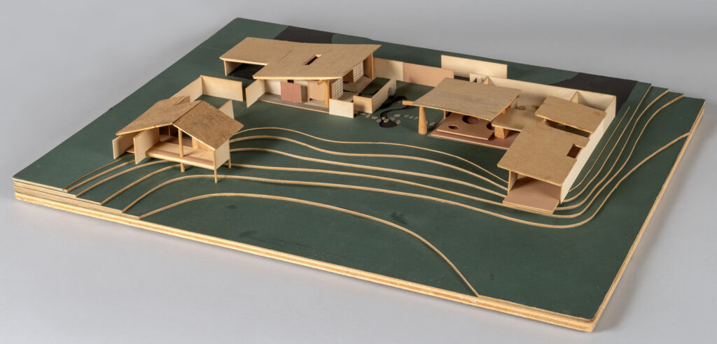 | Designed by Isamu Noguchi (American, 1904–1988) with Kazumi Adachi (American, 1913–1992), Model for Liam O’Gallagher and Robert Rheem House in Carmel, California [unrealized], 1955, plywood, paperboard, wood, paper, pencil, ink, paint, and stones, collection of the Oakland Museum of California. © 2026 The Isamu Noguchi Foundation and Garden Museum, New York / Artists Rights Society (ARS), New York. |