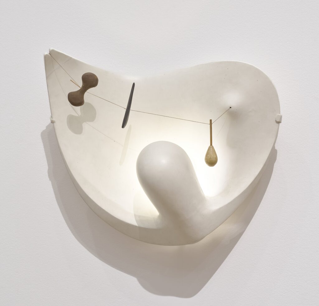 | Made by Isamu Noguchi (American, 1904–1988), Floating Lunar (Light Plaque), 1943–1944, gypsum plaster, paint, wood, electrical components, and cotton thread, Baltimore Museum of Art, gift of Edward M. Benesch, 1961.46. Photo by Mitro Hood. © 2026 The Isamu Noguchi Foundation and Garden Museum, New York / Artists Rights Society (ARS), New York. |