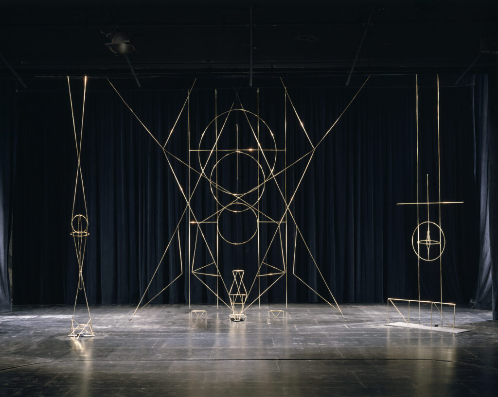 | Designed by Isamu Noguchi (American, 1904–1988), fabricated by Edison Price (American, 1918–1997), Stage Set Elements from Seraphic Dialogue, 1955, brass rods and steel cable, Martha Graham Center of Contemporary Dance. Photo by Kevin Noble / The Noguchi Museum Archives, 00363. © 2026 The Isamu Noguchi Foundation and Garden Museum, New York / Artists Rights Society (ARS), New York. |