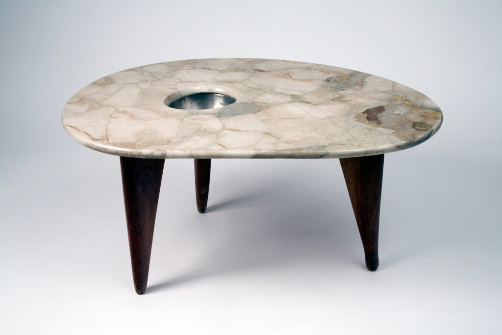 Made by Isamu Noguchi (American, 1904–1988), Marble-Topped Coffee Table, 1945, marble, wood, and spun aluminum, private collection, courtesy of The Isamu Noguchi Foundation and Garden Museum, New York. Photo by Kevin Noble. © 2026 The Isamu Noguchi Foundation and Garden Museum, New York / Artists Rights Society (ARS), New York.