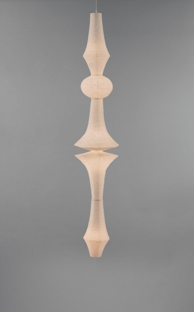 | Designed by Isamu Noguchi (American, 1904–1988), fabricated by Ozeki & Co., Ltd. (Gifu, Japan, established 1891), Akari (model E), designed 1951–1954, manufactured beginning 1954, mulberry bark paper, bamboo, and wire, High Museum of Art, Atlanta. Photo by Kevin Noble / The Noguchi Museum Archives, 152735. © 2026 The Isamu Noguchi Foundation and Garden Museum, New York / Artists Rights Society (ARS), New York. |