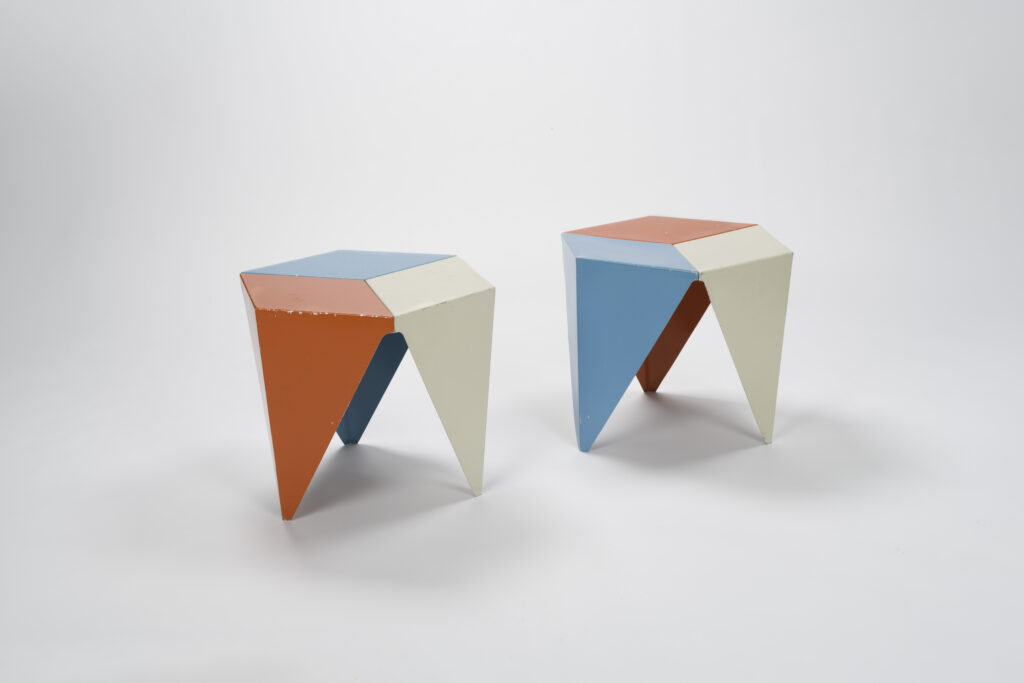 | Designed by Isamu Noguchi (American, 1904–1988), manufactured by Aluminum Company of America (Alcoa) (Pittsburgh, Pennsylvania, established 1888), Prismatic Tables, 1957, painted aluminum, Carnegie Museum of Art, gift of Torrence M. Hunt, Sr., 2004.9.1-.2. Image courtesy of Carnegie Museum of Art, Pittsburgh, Pennsylvania / Art Resource, New York. © 2026 The Isamu Noguchi Foundation and Garden Museum, New York / Artists Rights Society (ARS), New York. |